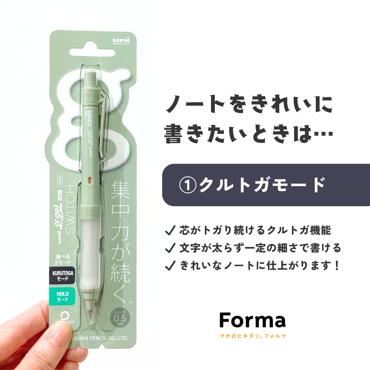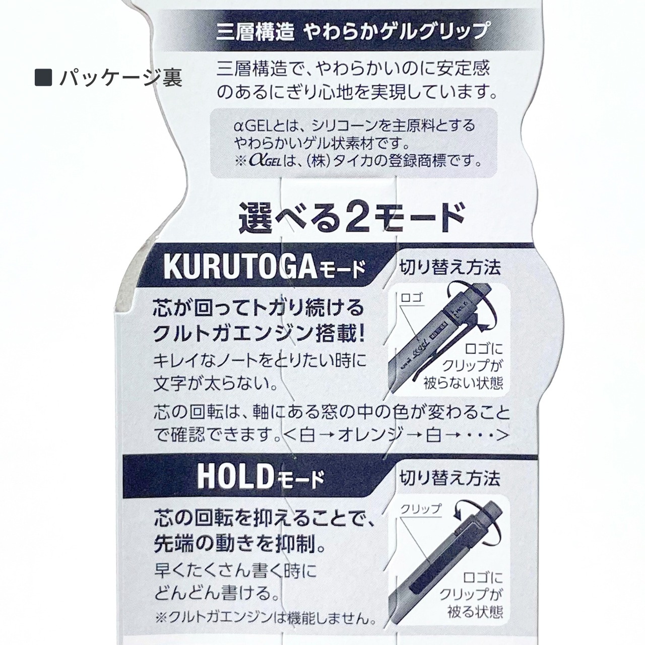 一定の細さ・濃さでキレイな文字を書きたいときには、“クルトガモード”、安定した筆記感でたくさん書きたいときには、“ホールドモード”と切り替えて使うことができます。